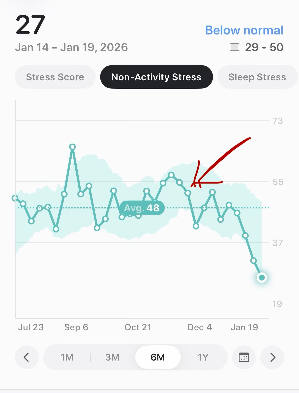 I use Bevel to track things like recovery and health statistics, and I recently looked at my 6-month overall non-exercise stress levels. The arrow is when Adam got laid off, the Monday after Thanksgiving weekend (the subsequent peak is the 10-hour drive to L.A. at Christmas, haha). It confirms my subjective perception that having a non-working spouse significantly reduces stress! Especially given that I am required to be in the office four days a week, having someone to do basic things like walking the dogs, making dinner, and running errands during the day – not to mention larger tasks like project-managing getting our shower re-tiled and re-plumbed – is a huge relief.